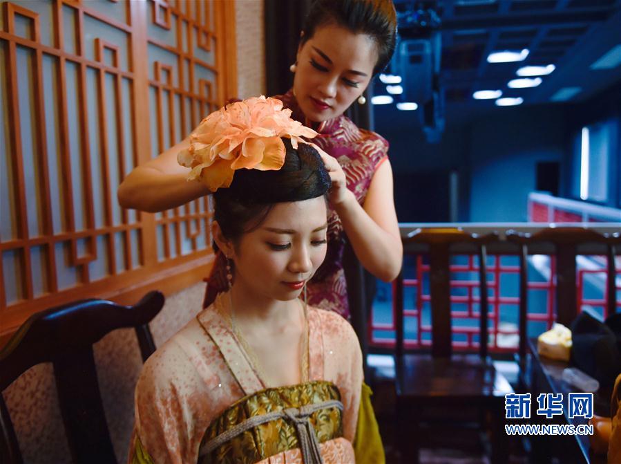 8月4日,廈門市南樂團“80后”演員陳慧雅(后)為“95后”演員李藝芳戴上頭花。新華社記者 宋為偉 攝