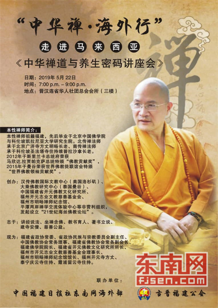 東南網5月16日訊(本網記者 夏芳)為促進福建與“一帶一路”沿線國家和地區民心相通和情感交流,傳承與弘揚中華優秀傳統文化,推動中馬民間文化交流合作,5月19日至25日,由福建日報社東南網海外部、馬來西亞古晉福建公會主辦的“中華禪·海外行”走進馬來西亞活動將在馬來西亞吉隆坡、古晉、馬六甲展開。 系列活動包括舉辦禪學講座,拜訪馬來西亞閩籍社團,走訪青山巖、鳳山寺及青云亭等。活動期間,福建省政協常委、福建佛學院院長、福州開元寺方丈、本性禪師將作題為《中華禪道與養生密碼》的禪學講座。屆時,廣大馬來西亞民眾將和本性禪師進行近距離接觸,一探中華禪文化的奧妙之處,感受不同文化之間的交流互鑒。 馬來西亞古晉福建公會已于5月14日在古晉召開新聞發布會,介紹“中華禪·海外行”走進馬來西亞的活動情況及中華禪文化的獨特魅力?!秶H時報》《詩華日報》《星洲日報》等馬來西亞當地主流媒體相繼進行報道。 “中華禪·海外行”活動此前已于今年1月和3月分別走進日本和菲律賓,在海外僑界中引起廣泛關注和熱烈反響。