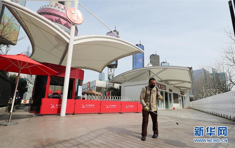 3月12日,工作人員在上海東方明珠廣播電視塔入口處噴灑消毒水。 當(dāng)日,著名地標(biāo)上海東方明珠廣播電視塔、上海中心大廈上海之巔觀光廳、金茂大廈88層觀光廳恢復(fù)開放。各景區(qū)都采取實名制預(yù)約、測溫入館、限流等方式,盡可能降低景區(qū)人員密度,保障游客安全。 新華社記者 方喆 攝