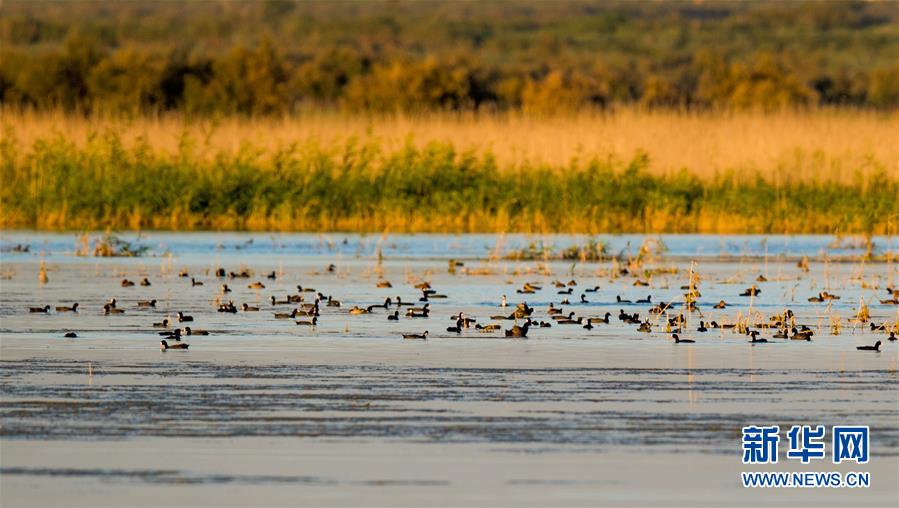 7月28日,成群候鳥在桃力廟—阿拉善灣海子覓食。 鄂爾多斯?jié)竦匚挥趲?kù)布齊沙漠、毛烏素沙地接壤地帶,2002年被列入國(guó)際重要濕地名錄。從2006年開始,由于濕地湖面萎縮、湖心島消失,在此筑巢繁殖的世界瀕危物種遺鷗幾近消失。近年來,當(dāng)?shù)夭扇《喾N治理措施,濕地生態(tài)環(huán)境逐步好轉(zhuǎn)。2019年起,濕地內(nèi)的桃力廟—阿拉善灣海子迎來遺鷗大規(guī)模“回歸”。如今,40多種鳥類在此棲息,鄂爾多斯?jié)竦刂匦鲁蔀轼B類的樂園。 新華社記者 連振 攝 |