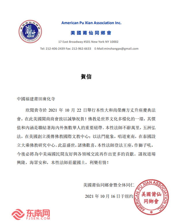 美國莆仙同鄉(xiāng)會(huì)賀信